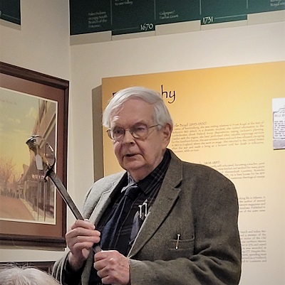 The presentation included briefings by Richard Hoover about bladed weapons and Dale Corey on muskets and rifles used during the Revolutionary War. Hoover presented four swords, a pike and the use of the bayonet as a major infantry weapon at the time. Corey brought three muskets and a rifle.