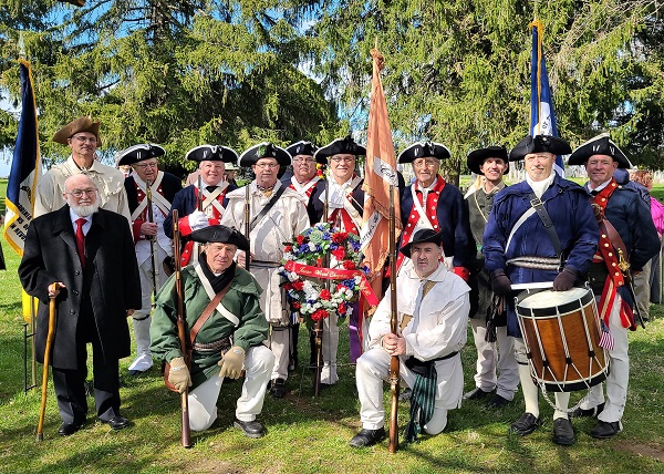 The ceremony was emceed by Fairfax Resolves (Virginia) President David Huxsoll and Sergeant L. Everhart (Maryland) President Karl Woodcock. There was a presentation of the colors by the Virginia State Color Guard commanded by Brett Osborn (CJWII). Society greetings were given by Virginia State President Bruce Meyer, Maryland State President Mark Deeds, Virginia State DAR Vice Regent Laurie Nesbit, Virginia Society Children of the American Revolution President Sara Cox and Virginia Order of Founders and Patriots Governor Dr Michael Weyler. Vice Mayor of Lovettsville, Christopher Hornbaker welcomed the audience and read a proclamation, with Mike Sapf providing a history of New Jerusalem Lutheran Church. Wreath presentations followed a roll call and biography of the patriots. Wreaths were presented by five State Societies, nine SAR Chapters, nine DAR Chapters, two CAR Societies and the Virginia OFPA. A musket salute of three rounds was provided by the Virginia SAR Musket Squad.