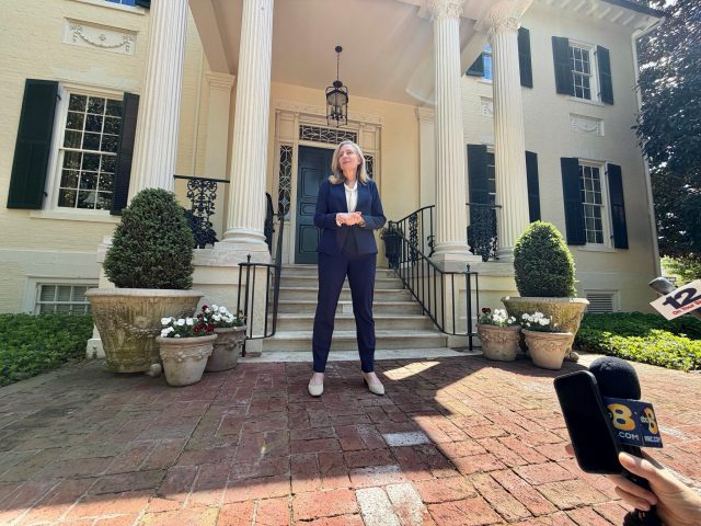 Gov. Abigail Spanberger speaks with reporters outside the Executive Mansion in Richmond last week. (Photo by Markus Schmidt/Virginia Mercury)