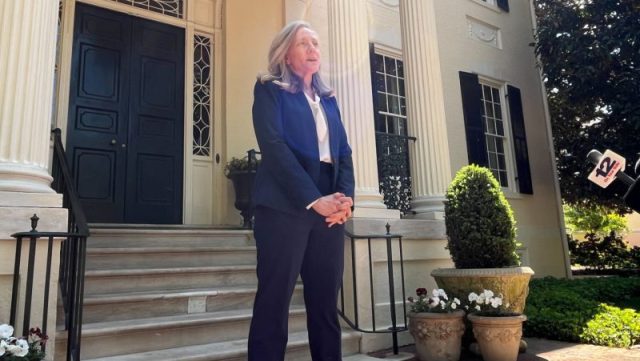 Gov. Abigail Spanberger addresses the media outside of the governor’s mansion in Richmond on April 8, 2026. (Photo by Shannon Heckt/Virginia Mercury)