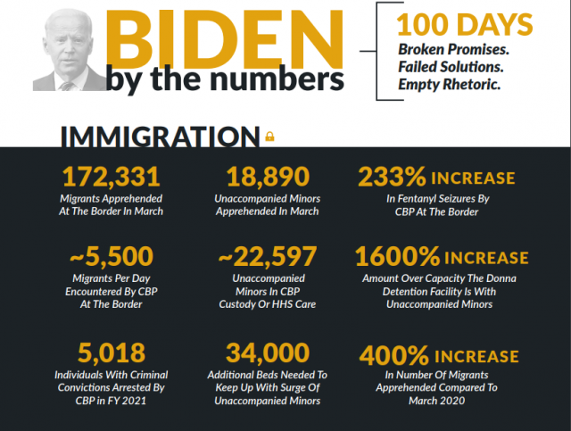 Through promises of amnesty and open borders, the Biden Administration has created an out-of-control surge of illegal immigrants and drugs along the U.S.-Mexico border. According to Customs and Border Protection, there has been more than a 400 percent increase in the number of migrants apprehended in March 2021 compared to March 2020, and there has been a 233 percent increase in fentanyl seizures at the border.