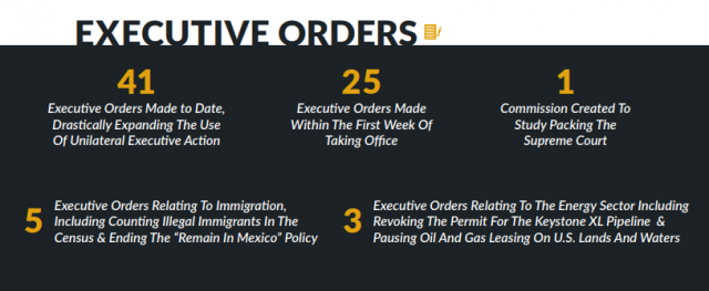 On the campaign trail, President Biden said, “You can’t [legislate] by the executive order unless you’re a dictator… We need consensus.” 100 days later President Biden — loving his dictatorial pen and forgetting the need for consensus — has smashed modern records for executive actions in his first 100 days, signing nearly double that of Presidents Trump and Obama in the same time frame. Biden’s orders include halting construction of the border wall thus opening the gates for the current border crisis, lifting the travel ban on terrorist-ravaged countries, stopping the U.S. from withdrawing from the WHO, and ruining women’s sports by allowing biological men to compete against them.