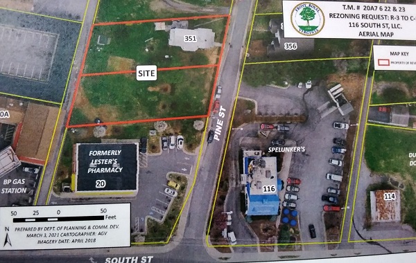 The first item was a rezoning application by William Antonelli and 116 South St, LLC, which may be better known as Spelunkers, a popular restaurant on the corner of Pine and South Streets. The applicant is seeking the rezoning of two lots across Pine Street which they have purchased to provide overflow parking and restaurant storage capacity. The two lots are currently zoned Residential (R-1), and the applicant is requesting them to be rezoned to Community Business District (C-1) to accommodate their use for this purpose. The properties on 3 sides of the applicant’s property are already zoned C-1, so this is a minor expansion of that zone.