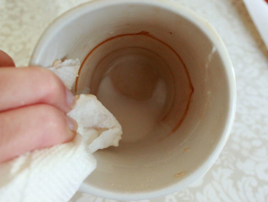 Now rub the paste over the offending coffee stains with a soft cloth or sponge. Clean off with a wet sponge and dry.