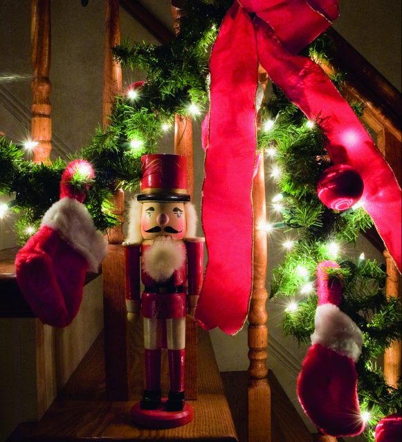 If they’re wide enough, put decorations directly on the stairs. Pillar candles (battery-operated ones are safest), wooden decorations and festive figurines can help create the holiday ambience you’re after.