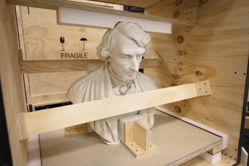 Roger Taney’s bust sits in a crate after being removed from the Old Supreme Court Chamber in the U.S. Capitol. (Photo by Senate Photographer Dan Rios)