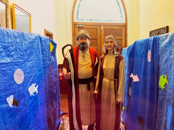 Dave Marchand and daughter Sara part the Red Sea during the 2021 Escape from the Wilderness Bible School program.