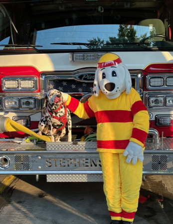 Stephens City Volunteer Fire & Rescue (SCVFR) mascots, Sparky the Fire Dog, and Ember the Dalmatian. Engine 11 Pierce Arrow Velocity Custom Pumper, 2,000 GPM and 1,000 GWT, 6-person cab in the background. Courtesy SCVFR.