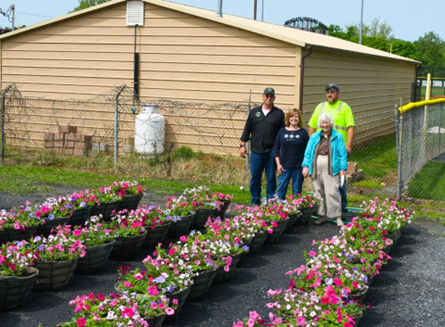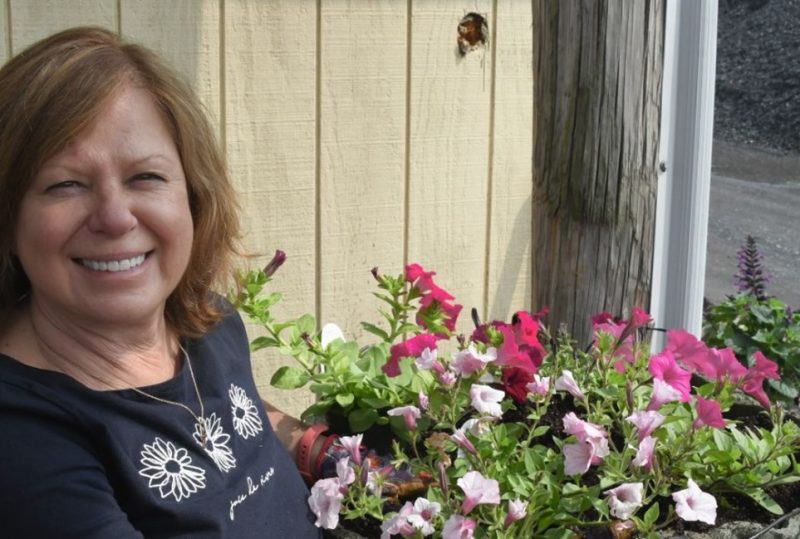 Lisa Schwartz (president BFRC), Beautiful Petunias, and a beautiful happy gardener.