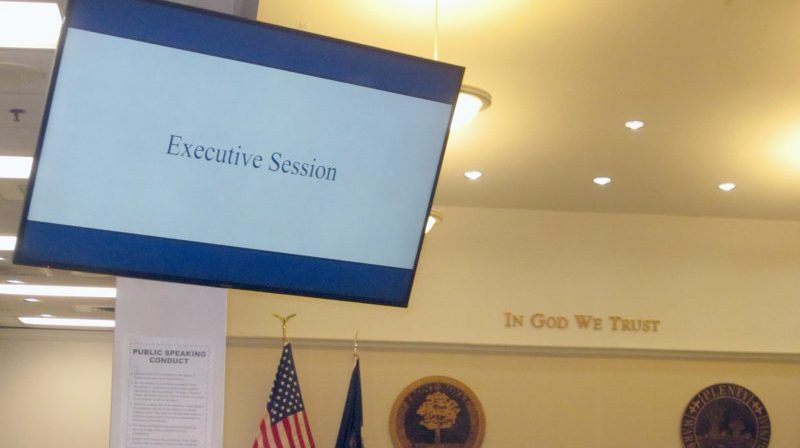 The Closed/Executive Session sign was up almost an hour prior to the open meeting’s convening at 1 p.m. Below, the empty dais was in closed session, and the board returned to the meeting room for the regular Open Meeting.