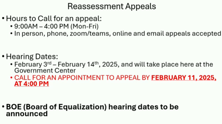 As to the property reassessment processes, County Administrator Daley presented a Power Point (34:37 Linked video mark) explaining how citizens can request a challenge of reassessments they believe are too high. To summarize, Reassessment Appeals to the contractor, Cowan Services LLC, must be filed by February 11th.
