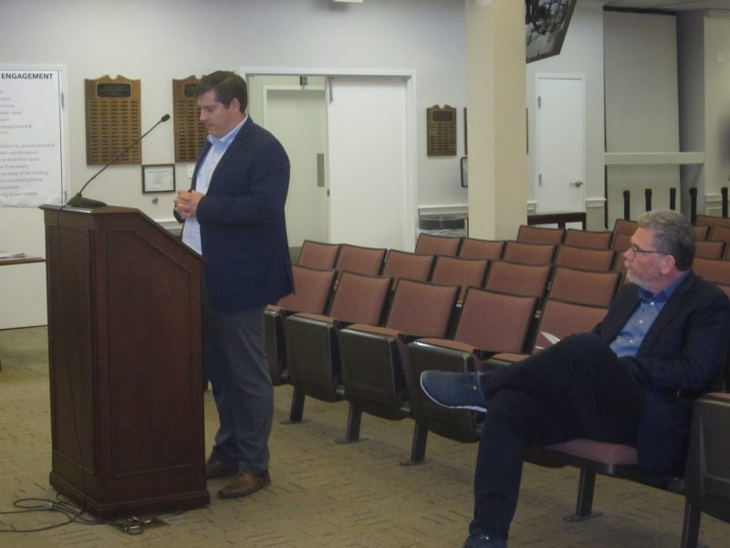 Staff, including IT Director Todd Jones at podium and applicant, seated, listen as Supervisor Vicky Cook, top left, questions financial variables in ACOM LLC Technical Services contract renewal request. Below, ACOM principal Rob Adanitsch explained his company’s services and community involvement in bringing IT educational instruction to local students through Samuels Public Library, as well as tech-related scholarship contributions. Four out of five supervisors liked what they heard.