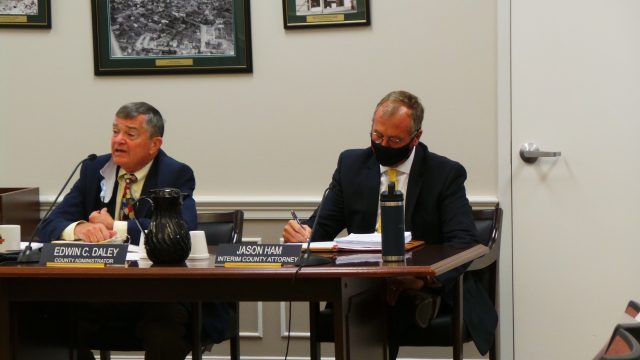 County Administrator Ed Daley, seated left, elaborates on grant financing variables that appear poised to cover the County’s Phase 2 matching cost of $6.9 million.