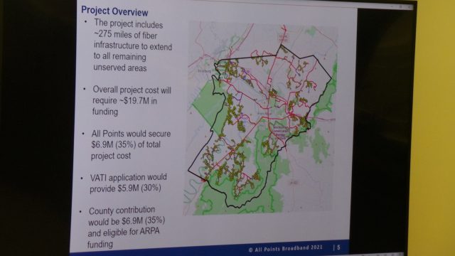 The supervisors’ vote, approving a Resolution in support of continuing into Phase 2 of the All Points Broadband “Regional Application” process, aligns Warren County with at least three other communities that have approved similar resolutions. Clarke, Augusta, and Rockingham Counties were identified as having approved their continued participation in recent days. Three others – Frederick, Page, and Rappahannock Counties – are scheduled to vote on Resolutions of Support of the All Points Broadband regional partnership within the next two days, Carr told the Warren supervisors. Shenandoah County is the lone dropout from Phase 1, apparently due to an opportunity with electrical provider Shentel, based in Shenandoah.