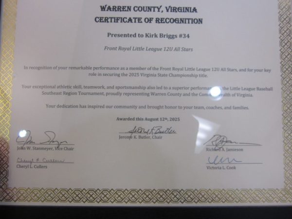 Due to an apparent “Communication Breakdown” — with a musical nod to that Led Zeppelin song title from this writer’s youth — the Warren County Board of Supervisors scheduled lead-off work session recognition of the Front Royal 12+under Little League Virginia State Championship team, which acquitted itself well in the Little League World Series-qualifying Regionals in Georgia where they were eliminated in the Regional Semifinals by the South Carolina team that eliminated defending champions Florida in the Regional Finals, it was on to other business.
