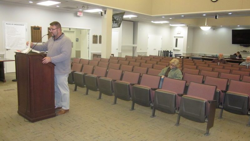 Little Boy Ventures legal representative John Foote hands out accompanying material to his analysis of county board concerns of too broad an impact of approval of a commercial type of redevelopment use in an Ag District sought by his client. Below, Foote at the podium as attorney Joe Silek Jr., third row center, and his clients, Little Boy Ventures closest Ag district neighbors, listen, and await their turn to reply.