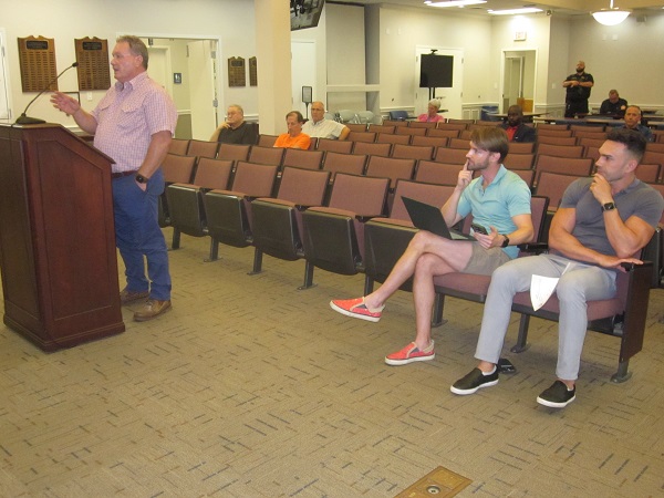 Co-owner of the Short-term Rental property, Scott Frost, explains the timeframe of notice of the parking violations being conveyed to his and partner Roman Semenov’s attention by the county planning department. Below, the war of words is on after neighbor contradicted what Frost said about the timeframe of being notified about tenant parking violations, as Frost and Semenov listen from the front row.
