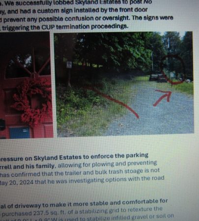 Frost then asserted that once notified, he and his co-owner had taken “pro-active steps” to keep tenants from parking at the bottom of what he termed their “steep driveway, intruding onto the public right-of-way. He said that neighbors with similar steepness issues also tended to park in a similar manner to how their rental tenants were, to deal with the steepness issue.  He also observed that a previously unmaintained “flat area” of their property had been “refinished” by Skyland Estates, so that renters could access that area to park, avoiding the steep driveway altogether.