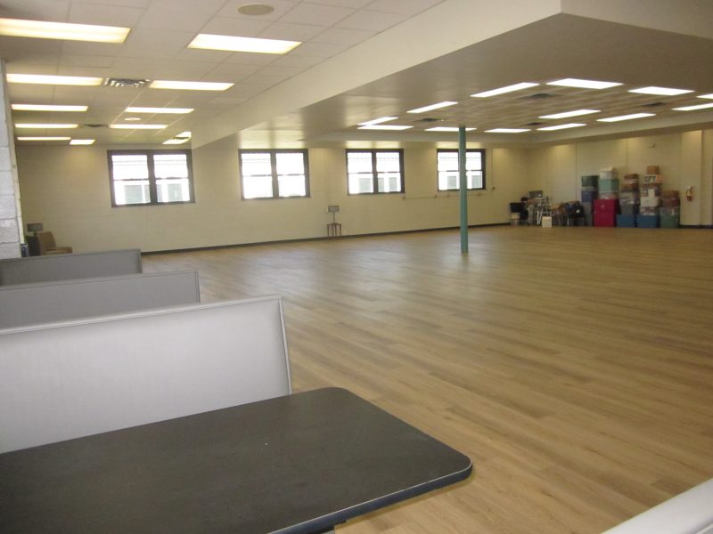 Deputy County Administrator Jane Meadows, right, gives supervisors and other involved personnel an overview of the status of the almost-ready Senior Center in a renovated portion of the County’s Health & Human Services complex off of 15th Street in Front Royal. Below are two perspectives on what appears to be a main dining area with space for other activities as needed. Royal Examiner Photos Roger Bianchini