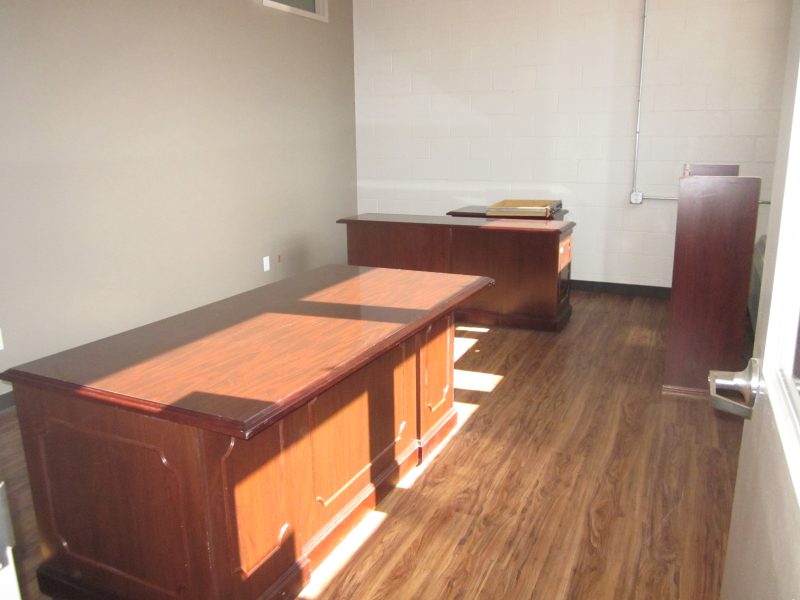 Meadows shows tour auxiliary rooms with work desks and a bathroom area with a walk-in shower.