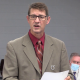 Mike Mayer of Front Royal, Va., wearing a head band but no mask, referred to the audience attending the Warren County School Board’s Wednesday, May 5...