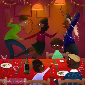 Once upon a time, in the town of Mount Christmas, the Ombazi family was celebrating Christmas Eve in a private dining room at the Joyous Delights restaurant. The nearly 50 guests had just finished a delicious feast, and they were all having a great time. Kids and grandparents danced along to a silly song about a family of sharks. Teams of relatives faced off in a lively card game. Cousins played charades, while aunts and uncles told hilarious stories.
