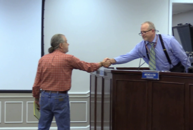 “Both have received my wrath from this podium many times, but both took their time to reach out to us and give us their condolences, and that means a lot – that’s all I have,” an emotional Gabbert concluded before leaving the public speakers’ podium to shake County Administrator Stanley’s hand at his place on the board and staff dais, as he would have with Carter as well if the Happy Creek supervisor had been present.