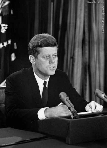 President Kennedy addresses the nation on live television during the Cuban Missile Crisis, when the U.S. and Soviet Union came to the verge of nuclear war according to later unclassified Soviet intelligence documents. It appears that Kennedy and Soviet Premier Nikita Khrushchev’s willingness to negotiate a mutually satisfactory compromise – that the Soviets pull their offensive nuclear missiles out of Cuba, and America would dismantle its offensive nuclear missile bases from the Soviet border in Turkey – averted a potential nuclear holocaust.