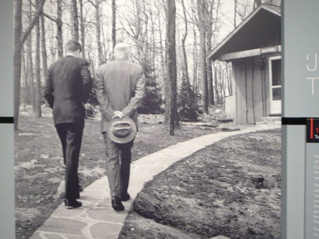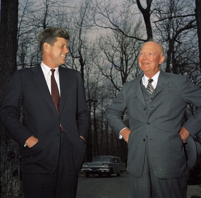 Presidents Kennedy and Eisenhower at Camp David, April 22, 1961, five days after the first crisis of JFK’s presidency, the failed CIA-sponsored Bay of Pigs invasion.