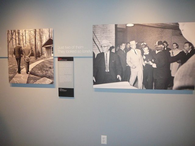 Above, JFK and Ike at Camp David in the days after the failed Bay of Pigs invasion of Cuba – likely when the sitting president found out he had been lied to by the CIA about the previous president’s authorizations, or lack thereof, for a CIA-sponsored invasion of Cuba. Photographer Paul Vathis wrote ‘They looked so lonely.’ Below, Vathis’s photo juxtaposed on the wall of the Newseum in D.C. with mob-connected Jack Ruby’s silencing of Lee Harvey Oswald, who died claiming he was set up as a patsy in the JFK assassination. JFK photo sources, credits: Public Domain; White House Photographs; John F. Kennedy Presidential Library and Museum, Boston; Robert Knudson; Paul Vathis; Abraham Zapruder; “The Men Who Killed Kennedy” Nigel Turner-produced British TV documentary series; AP; Roger Bianchini at Newseum, Washington D.C.