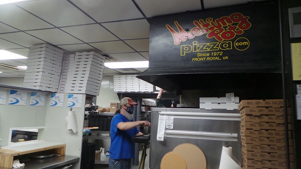 A 50th Anniversary flag flies outside the front, 14th St. entrance to The Melting Pot on northside Front Royal. Coincidentally, the flag was designed and produced by the evening’s first musical guest and MC Shae Parker in his Hanna Signs incarnation. And that ‘serving the world’ observation isn’t really an exaggeration as Melting Pot free-dried pizzas have been mail delivered near and FAR over the years. Below, a familiar sight – Doug Cameron at the front oven, staying busy Wednesday evening, April 6. Royal Examiner Photos by Roger Bianchini