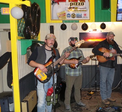 Parker then brought the second live act ever to The Melting Pot’s rear dining room somewhat compact stage area. That act was 4/6’s of the Vaughan family’s most recent musical incarnation “Aftershock”, featuring Reno Vaughan on lead vocals, dad and uncle respectively James and Dewey Vaughan on guitars and accompanying and occasional lead vocals, and Dean Smith on bass.