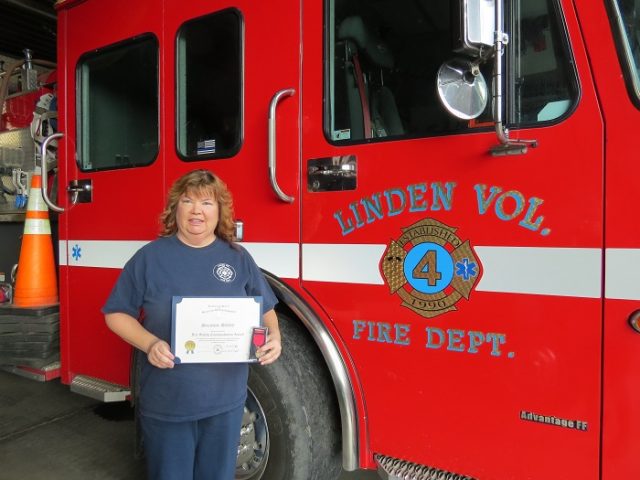 Bronze Fire Safety Commendation Medal awarded to Suzi Shiley, President of the Linden Volunteer Fire Department.