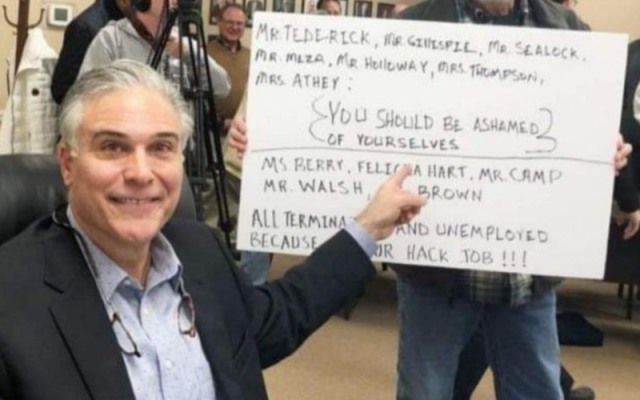 The interim town manager points to a critical sign held by Paul Gabbert at council work session not long after staff terminations were implemented. Photo/Va. Beer Museum website/Gabbert