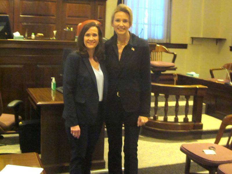 Circuit Court Clerk Angie Moore and incoming Sheriff Crystal Cline smile for the camera prior to the start of the swearing-in ceremony of 63 deputies. Below, incoming Sheriff Cline, arms extended, tells those deputies they will be part of a team she hopes to build to the mutual benefit, professionally and personally, of all its members. It is indicated those members will include a re-established Animal Control Department.