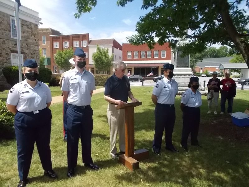 Piper and vet Jim Lundt calls this year’s Memorial Day ceremony to order shortly before noon, May 31. Below, flanked by R-MA cadets event founder Malcolm Barr Sr. acknowledged county vets killed in action in several wars; and further below, co-organizer Rob McDougall keynoted Monday’s ceremony.