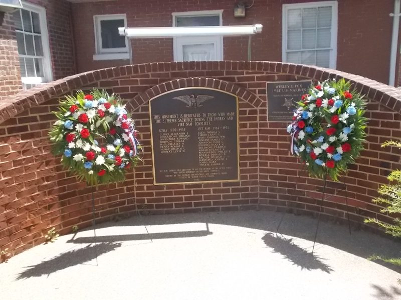 And let us not forget the World War I and World War II monument in whose shadow the ceremony occurred. Below, the Korea-Vietnam monument prior to the wreath-laying. A memorial to the County’s Civil War dead, now controversial to some due to the context of that war as a state rebellion against a federal initiative to end slavery, also stands on the courthouse grounds. As McDougall noted, Memorial Day began as Decoration Day in May 1868 in the aftermath of the Civil War.