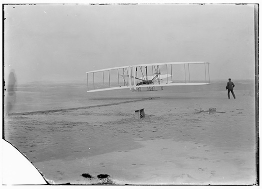 [First Flight, 120 feet in 12 seconds, 10:35 am; Kitty Hawk, North Carolina]. Orville Wright & John T. Daniels, photographers, December 17, 1903. Wright Brothers Negatives. Prints & Photographs Division