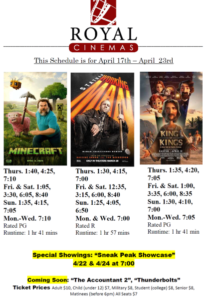 Here is a list of this week’s showtimes at Royal Cinemas as of Thursday, April 17th: