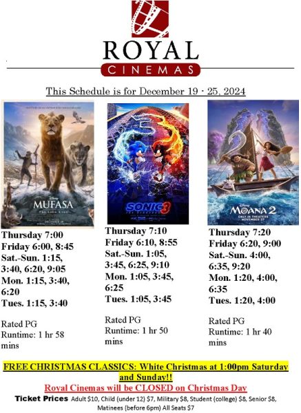 Here is a list of this week’s showtimes at Royal Cinemas as of Thursday, December 19th:
