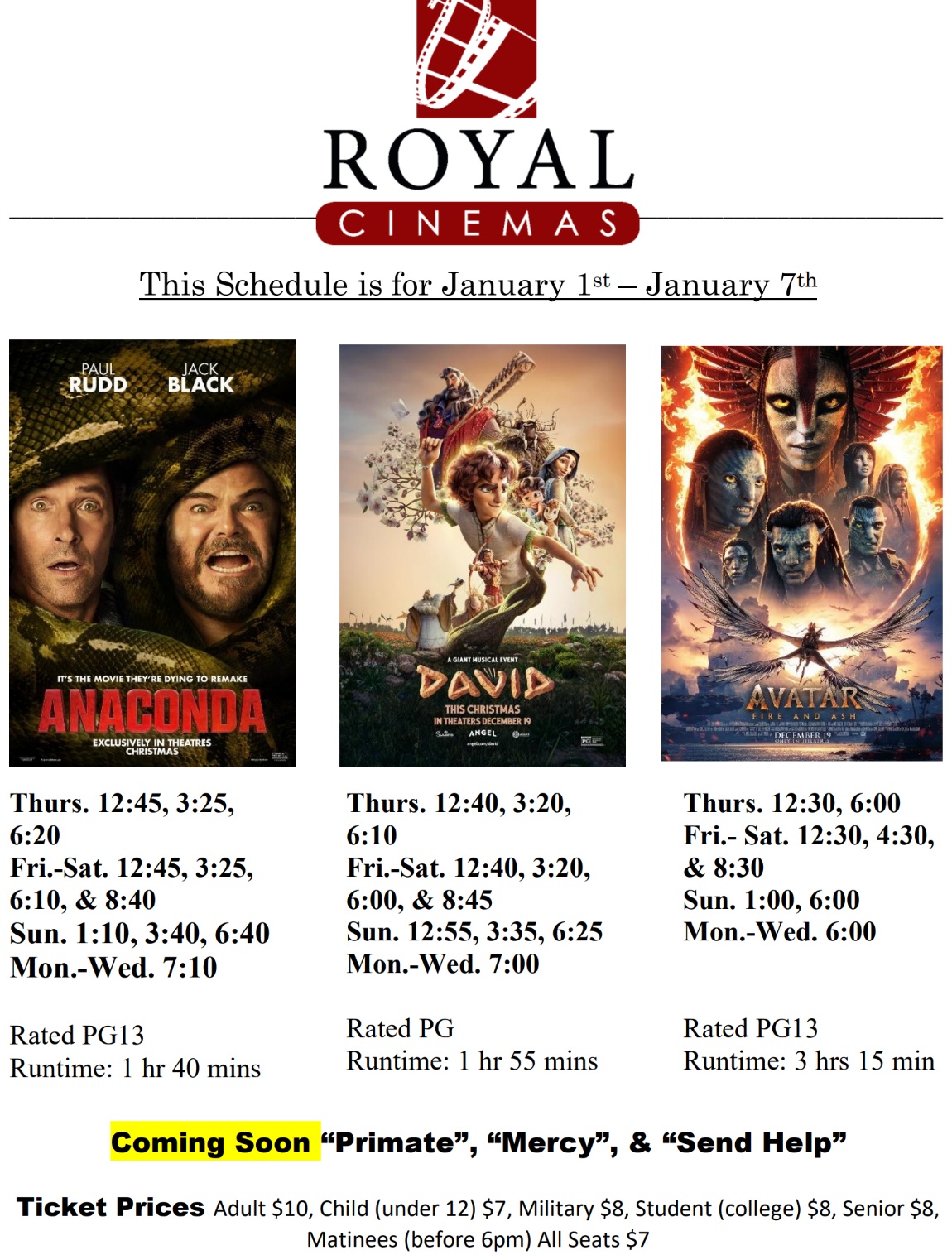 Here is a list of this week’s showtimes at Royal Cinemas as of Thursday, January 1: