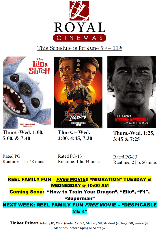 Here is a list of this week’s showtimes at Royal Cinemas as of Thursday, June 5: