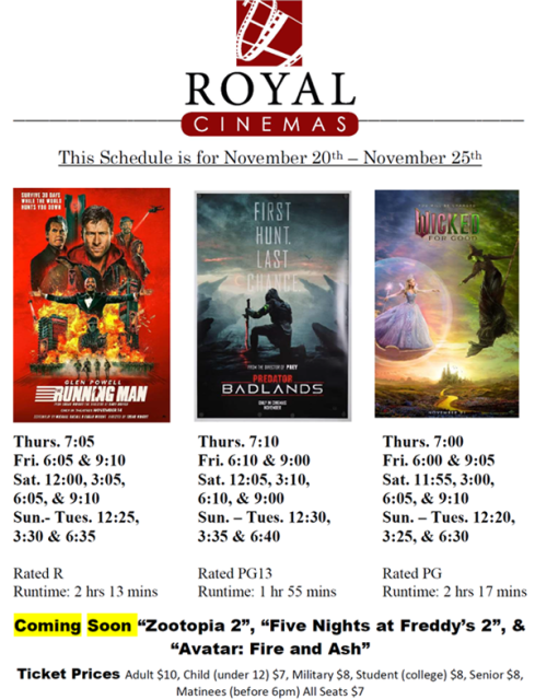 This Week’s Showtimes at Royal Cinemas as of November 20th