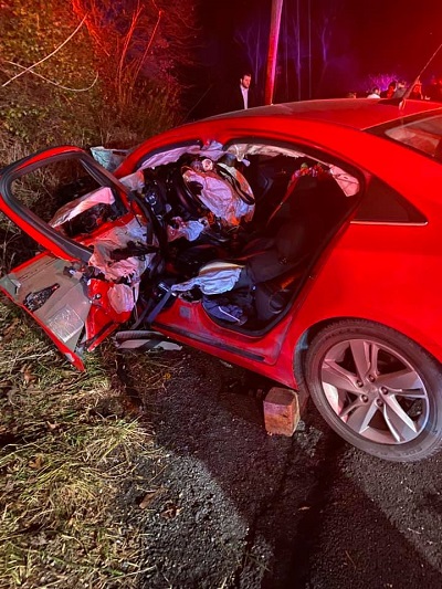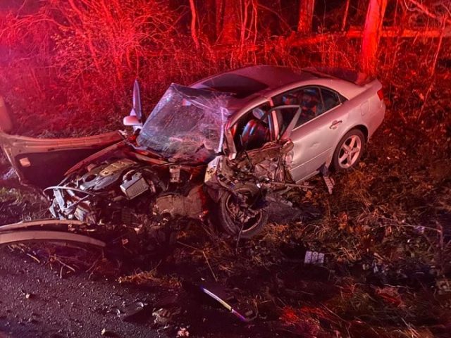 Above, White’s Chevy Cruze, and below the Hyundai Sonata following Saturday night’s head on collision that seriously injured all three occupants who were, fortunately wearing seatbelts. The driver of a third vehicle the Chevy was attempting to pass and struck trying to avoid a head-on was uninjured.