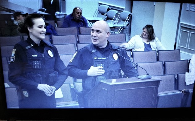 Captain Crystal Cline is welcomed back from completing classes at the Southern Police Institute by FRPD Chief Kahle Magalis. Cline told council her time there was well spent on a variety of fronts.