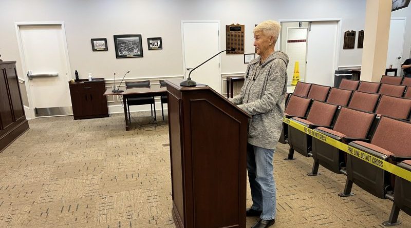 Barbara Martin, owner of six chickens, speaks in favor of the amendment to the town code that would allow up to ten