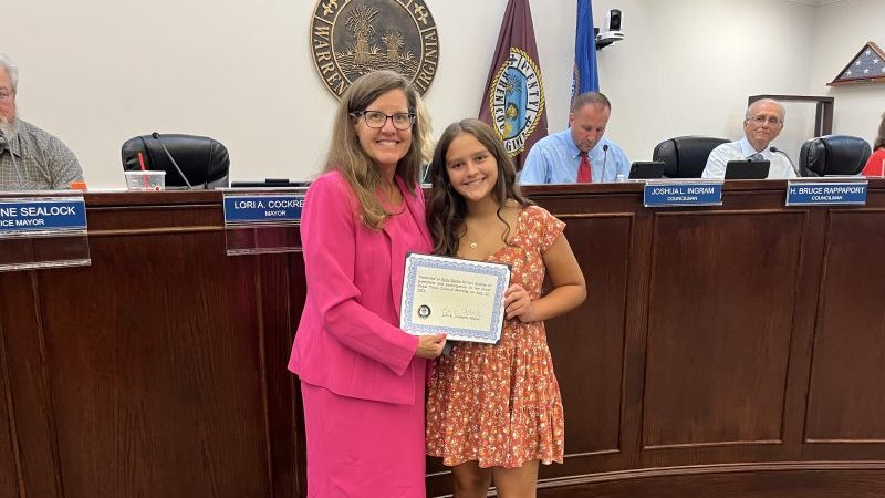 After leading the gathering in the pledge of allegiance, Bella Skube receives a gift certificate from Mayor Lori Cockrell, thanking her for her patriotism.