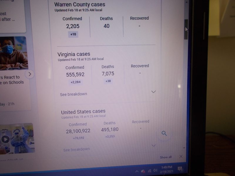 Now call me a cynic – but it appears that Lloyd would have council pass an ordinance taking the governor’s language a step further, in creating a Town Code presuming no one in Front Royal not wearing a mask would lie to cover the fact they just don’t want to and/or don’t believe it necessary to wear face coverings as mandated at the State level. Those public health mandates are a result of the ongoing COVID-19 Coronavirus pandemic that as of February 18, are reported by the U.S. Center for Disease Control (CDC) to have claimed 495,180 lives nationally, of those 7,075 in Virginia and 40 in Warren County over the course of about one year. Globally over 2.43 million deaths are attributed to the pandemic.