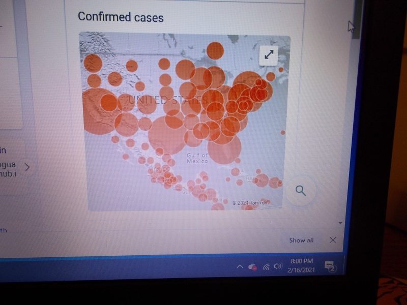 Above, CDC COVID-19 stats of Feb. 18, for the county, state, and nation; below a CDC graphic illustration of confirmed COVID cases in the U.S. and neighboring countries – ‘What, Me Worry?’