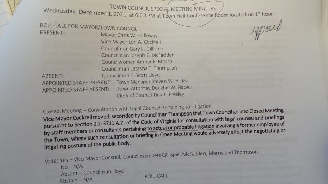 This reporter remains at a loss to explain the Town’s digging in of its collective “heel”, through its town manager, on this simple question about what “actual, ongoing litigation” was discussed on December 1? What would be lost if like the county government and the County EDA, the Town simply named the litigation to be discussed behind closed doors? No legal strategies or evidentiary assertions would be revealed, just a case name and vague reference to the behind-closed-door meeting’s “purpose” as in a need for legal counsel input or approaching filing deadlines. We cite that latter “purpose” because of the FOIA compliance issue raised about the December 1 meeting, not only being an unscheduled special one, but apparently also an “emergency” one in the bypassing of the FOIA three-day public notice requirement for coming meetings not called on an emergency time-frame basis.